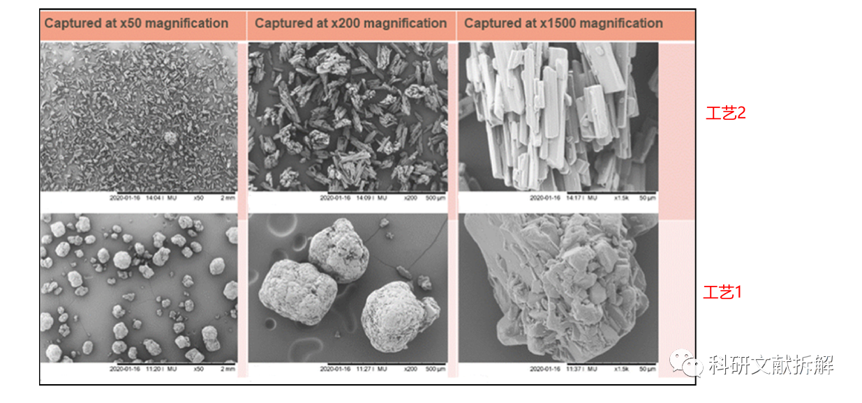 工藝1的晶體外觀為不規則小球狀,而工藝2得到的晶癖為柱形。