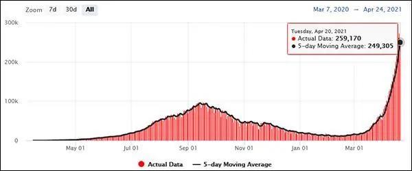 截止目前,印度已經連續五天刷新全球單日單個國家新增病例最高記錄。印度政府25日預測,該國這一波新冠疫情可能于5月中旬達到峰值,屆時每天新增確診病例將高達50萬例。