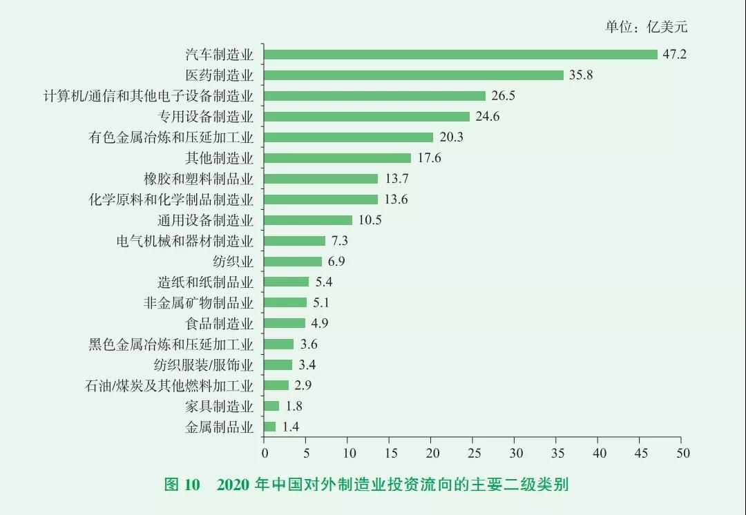 流向制造業(yè)的對(duì)外直接投資凈額為258.4億美元,同比增長(zhǎng)27.7%,占16.8%。主要流向汽車制造、醫(yī)藥制造、計(jì)算機(jī)/通信和其他電子設(shè)備制造、專用設(shè)備制造、有色金屬冶煉和壓延加工、其他制造、橡膠和塑料制品、化學(xué)原料和化學(xué)制品、通用設(shè)備制造、電氣機(jī)械和器材制造、紡織業(yè)、造紙和紙制品業(yè)、非金屬礦物制品、食品制造、黑色金屬冶煉和壓延加工、紡織服裝/服飾制造等。其中,流向化學(xué)原料和化學(xué)制品的投資13.6億美元,占制造業(yè)投資的5.3%。