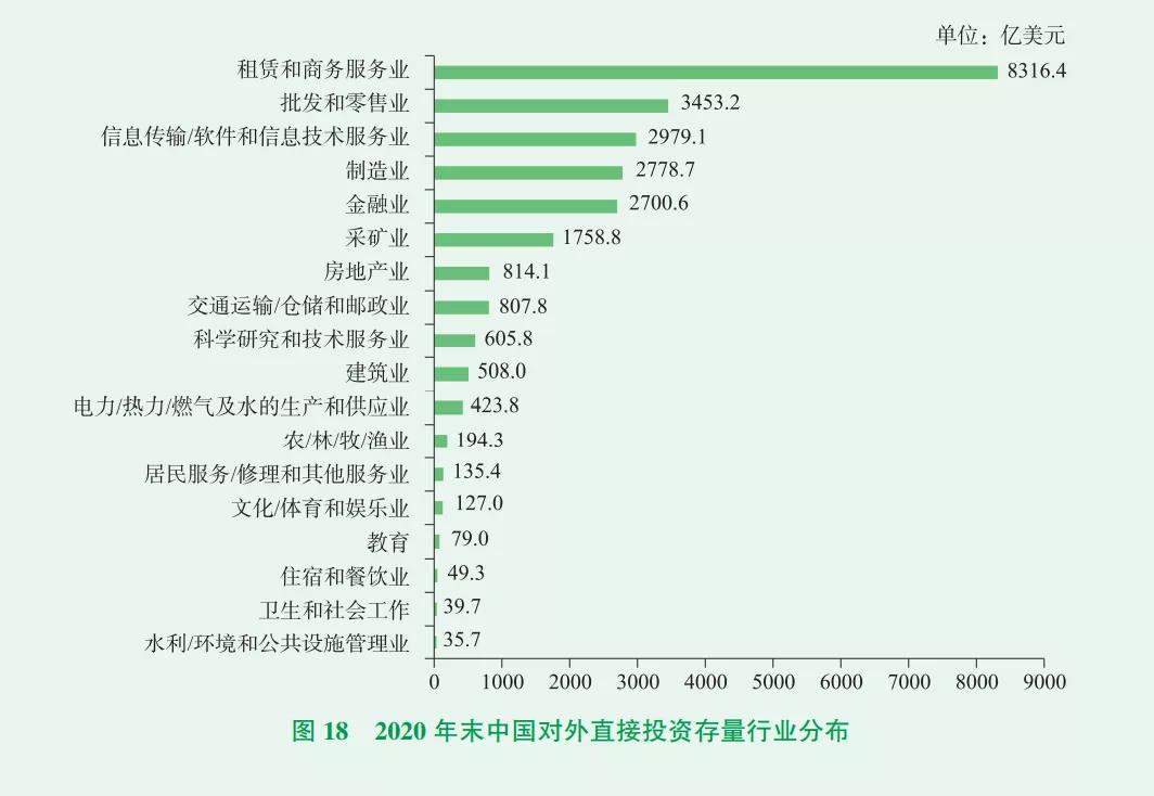 數(shù)據(jù)還顯示,2020年末,中國(guó)對(duì)外直接投資覆蓋了國(guó)民經(jīng)濟(jì)所有行業(yè)類別,存量規(guī)模上千億美元的行業(yè)有六個(gè)。