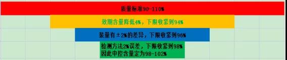 對于儲存期間含量逐漸下降的品種,中控含量限度除了要包容方法的誤差外,還要包容含量降低的幅度。假如成品的含量限度是90.0%-110.0%,含量在效期內預期降低6%,檢測誤差不會超過2%,則中控限度應定為98.0%-102.0%。