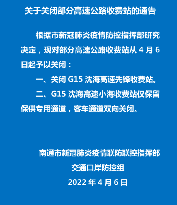 3.G4221 滬武高速,關閉溧水開發區東雙向出口。4.S55 寧宣高速,關閉溧水開發區雙向出口;關閉和鳳主線雙向出入口。S55 寧宣高速,石臼湖服務區雙向關閉;G25 長深高速,東廬山服務區雙向關閉。1.G15 沈海高速,關閉連云港西、新壩、灌云北雙向出入口。2.G25 長深高速,關閉贛榆南、大浦、宋跳、花果山機場、灌云南、灌南雙向出入口;關閉寧海往杭州方向入口及往山東方向出口;G25 長深高速,關閉灌云西往杭州出口及連云港方向入口。3.G30 連霍高速,關閉云臺、平明、東海西雙向出入口。G15 沈海高速,海州灣服務區、花果山服務區、灌云服務區雙向關閉;G30 連霍高速,東海服務區雙向關閉。3、S49 新揚高速高速,關閉新沂南、馬陵山雙向出口。G30 連霍高速,彭城服務區往鄭州方向關閉;G3 京臺高速,劉集服務區雙向關閉。1、G2 京滬高速,關閉淮安北、淮安東雙向出入口。2、G25 長深高速,關閉高溝雙向出口;關閉漣水往杭州出口;關閉淮陰往連云港方向入口及往杭州方向出口;關閉五里牌雙向出入口。3、G1516 鹽洛高速,關閉車橋、凌橋雙向出入口。4、S49 新揚高速,關閉盱眙北往宿遷方向入口,往南京方向出口;關閉黃花塘雙向出入口。G2 京滬高速,川星服務區往北京方向關閉;G2 京滬高速,六洞服務區往上海方向關閉。1.G15 沈海高速,關閉六套、蔡橋、興橋、白駒、富安雙向出口。2.G1516 鹽洛高速,關閉海豐雙向出入口;關閉秦南、建湖東雙向出口。3.G1515 鹽靖高速,關閉青墩、張莊、大岡雙向出口。G15 沈海高速,大豐服務區雙向關閉;G1516 鹽洛高速,九龍口雙向關閉。3.G2513 淮徐高速,關閉洋河雙向出口;關閉宿遷西雙向出入口。G2 京滬高速,沭陽服務區往北京方向關閉;G2513 淮徐高速,洋河服務區往徐州方向關閉。1.G2 京滬高速,關閉涇河、真武、江都東雙向出入口;關閉寶應、高郵往上海方向出入口;關閉浦頭雙向出口。3.S49 新揚高速,關閉蜀岡主線、陳集雙向出入口。G2 京滬高速,范水服務區往上海方向關閉;G2 京滬高速,高郵服務區往北京方向關閉;S49 新揚高速,陳集服務區雙向關閉;S39 江宜高速,揚州廣陵服務區往宜興方向關閉;G40 滬陜高速,儀征服務區雙向關閉。1.G1515 鹽靖高速,關閉安豐、新街雙向出口。2.G40 滬陜高速,關閉廣陵、季市雙向出入口 。4.S35 阜溧高速,關閉俞垛、大泗雙向出口;關閉高港雙向出入口。G2 京滬高速,宣堡服務區、廣陵服務區雙向關閉;S35 阜溧高速,大泗服務區雙向關閉。1、G15 沈海高速,關閉劉橋雙向出口;關閉先鋒雙向出入口。2、G40 滬陜高速,關閉疊石橋雙向出口;關閉大生、九華雙向出入口;關閉啟東東雙向入口;關閉葛市往南京方向出入口;如皋港往上海方向出入口。3、S79 南通支線,關閉平潮往南京方向入口,往南通方向出口。4、S28 啟揚高速,關閉如皋東、馬塘、海門港雙向出口;關閉合作、南陽雙向出入口。G15 沈海高速,如皋服務區、先鋒服務區雙向關閉;蘇通大橋服務區往南通方向關閉。2.G4011 揚溧高速,關閉鎮江西、上黨雙向出口。S35 阜溧高速關閉丹陽北、鎮江新區東、高橋雙向出口;關閉揚中雙向出入口。2.G4221 滬武高速,關閉嘉澤、滆湖、戚墅堰雙向出入口。5.S35 阜溧高速,關閉儒林、長蕩湖雙向出入口。6.S39 江宜高速,關閉孟河往宜興方向出口;關閉春江、龍城大道、武進經發區、武高新西雙向出入口;關閉和橋雙向出口。G4221 滬武高速,茅山服務區雙向關閉;G25 長深高速,天目湖服務區雙向關閉。1.G42 滬蓉高速,關閉無錫東雙向出口;關閉玉祁、無錫北、無錫、蘇南碩放機場雙向出入口。2.G4221 滬武高速,關閉青陽雙向出口;關閉新橋雙向出入口。5.S19 通錫高速,關閉東港、無錫新區、碩放、新安雙向出入口;關閉羊尖、安鎮雙向出口。6.S58 滬常高速,關閉馬山雙向出口;關閉軍嶂雙向出入口;關閉華莊雙向入口。G2 京滬高速,梅村服務區雙向關閉;S19 通錫高速,宛山蕩服務區雙向關閉;G4221 滬武高速,新橋服務區雙向關閉。1.G2 京滬高速,關閉陽澄湖、昆山高新區昆山、陸家、收費站關閉雙向出入口。2.G15 沈海高速,關閉沙溪、太倉市區往連云港方向出口。3.G1521 常嘉高速,關閉白茆、李市雙向出口;關閉吳淞江工業園雙向出入口。7.S48 滬宜高速,關閉周市、陽澄湖北雙向出入口。G15 沈海,沙溪服務區雙向關閉;G1521 常嘉高速,澄湖服務區、石牌服務區雙向關閉;G1522 常臺高速,白洋湖服務區雙向關閉;S19 通錫高速,錦豐服務區雙向關閉。因疫情防控需要,省內高速以下收費站出口或者進出口有關閉情況,分別是:嘉興境內高速:嘉紹高速南湖、王店東收費站;滬杭高速王店、嘉興東收費站;申嘉湖高速 王江涇、新塍、油車港收費站;乍嘉蘇高速余新、鳳橋、馬家浜、雙向秀洲收費站出口;溫州境內高速:甬莞高速龍港進出口;龍沙、錢庫、馬站進口;甬臺溫高速觀美、蒼南進口;湖州境內高速:練杭高速雙向桐鄉西進出口;申嘉湖高速雙向南潯南進出口;臺州:G15沈海高速溫州方向溫嶺西、臺州南、臺州、臨海南、臨海北、三門收費站進口關閉(建議G1523甬皖高速路橋收費站下高速);因疫情防控需要,G1522常臺高速雙向天臺服務區,G15沈海高速雙向臺州服務區,S28臺金雙向高速臨海、仙居服務區,S9蘇臺高速雙向街頭服務區,S26諸永高速雙向神仙居服務區,G1523甬莞高速雙向蛇潘、臨海東、溫嶺、蘆浦服務區,以上服務區除加油及停車外,暫停對外所有服務。杭州繞城高