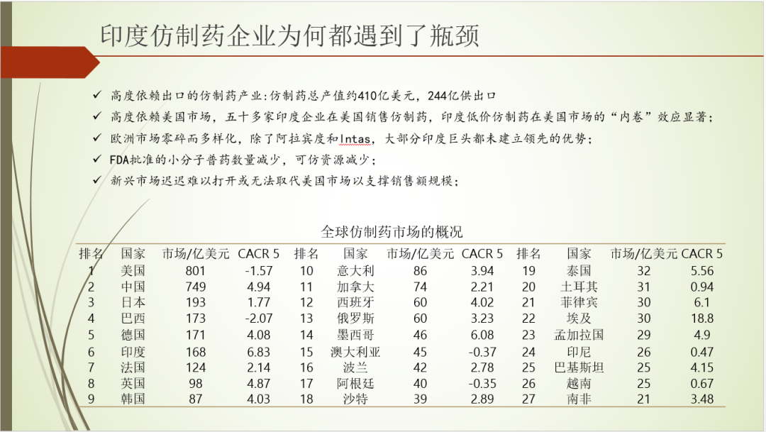 印度仿制藥企業的發展瓶頸也將為我國仿制藥的出海之路帶來更多挑戰,而且這種瓶頸,我國藥企也將面臨,有心者需要未雨綢繆。