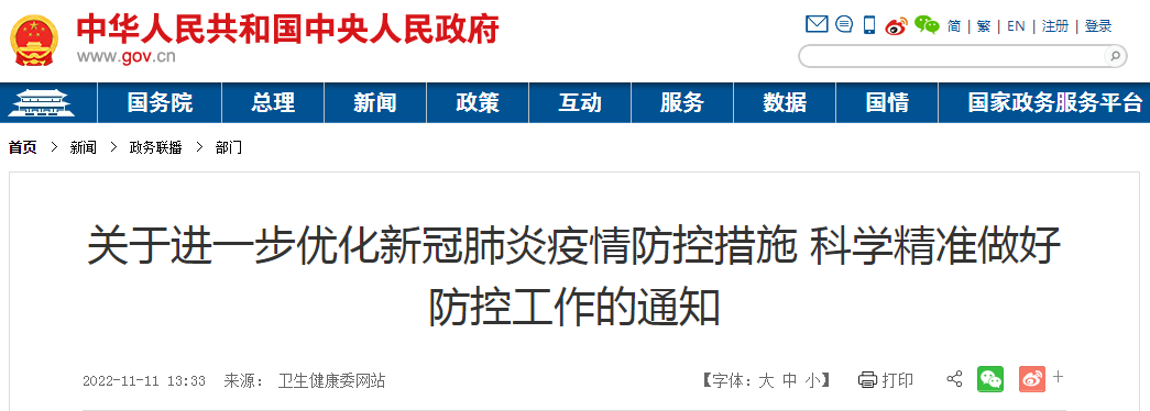 11月11日,國務院應對新型冠狀病毒肺炎疫情聯防聯控機制綜合組發布了《關于進一步優化新冠肺炎疫情防控措施,科學精準做好防控工作的通知》。