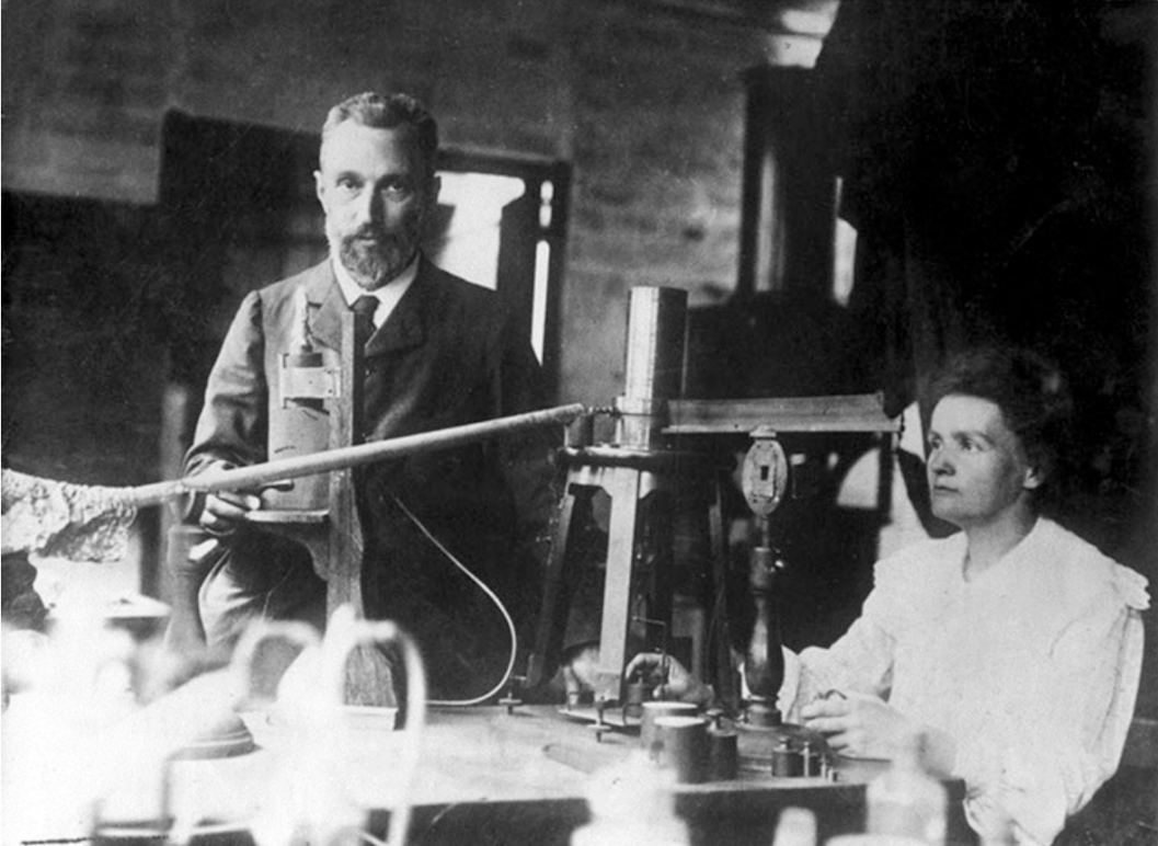 圖2 貝克勒爾的底片因暴露在鈾鹽的輻射中而起霧的圖像盡管貝克勒爾因放射性獲得諾貝爾獎(jiǎng),但是,“放射性”這一術(shù)語本身是由著名的居里夫人(瑪麗?斯克洛多夫斯卡?居里)創(chuàng)造的。1897年,瑪麗正在為她的博士論文研究尋找一個(gè)主題。她被貝克勒爾的工作所吸引,決定利用她丈夫皮埃爾和他的兄弟雅克建造的基于壓電效應(yīng)的電子測量儀,系統(tǒng)地研究鈾的“射線”。居里夫人發(fā)現(xiàn),釷發(fā)出的射線與鈾相同,而且射線的強(qiáng)度不取決于化學(xué)成分,只取決于樣品中鈾或釷的含量。她得出結(jié)論,輻射并不取決于分子中原子的排列,而是與原子本身的內(nèi)部有關(guān)。這是一個(gè)革命性的發(fā)現(xiàn),完全改變了物理學(xué)的領(lǐng)域。除了鈾元素,瑪麗和她的丈夫皮埃爾陸續(xù)發(fā)現(xiàn)了多種放射性元素,包括釷、釙和鐳。居里夫婦因其在放射性方面的工作,于1903年獲得了諾貝爾物理學(xué)獎(jiǎng)。
