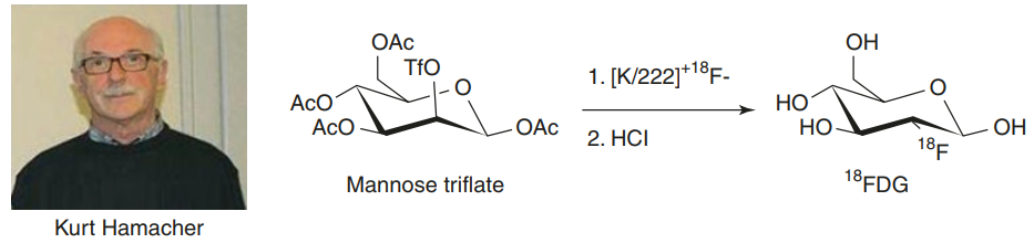 圖9 亨利?瓦格納在華盛頓大學(xué)的一臺早期PET掃描儀內(nèi)隨著成像設(shè)備的發(fā)展,放射性標(biāo)記物的開發(fā)也提上日程。2-脫氧-2-[18F]氟-D-葡萄糖—即[18F]FDG或簡稱FDG,是一種葡萄糖的放射性標(biāo)記形式,其中一個(gè)氟-18原子取代了一個(gè)羥基。有了18FDG,就有可能首次將Louis Sokoloff開發(fā)的[14C]2-脫氧葡萄糖自顯影法應(yīng)用于臨床。雖然[18F]FDG最初是為腦部成像而開發(fā)的,但20世紀(jì)70年代末和80年代初的其他一些臨床前研究表明,這種放射性示蹤劑也可用于心肌代謝和腫瘤代謝的成像。1986年,Kurt Hamacher開發(fā)了一種使用[18F]氟化物的FDG合成方法,這是一個(gè)重要的里程碑。[18F]FDG的突破性發(fā)現(xiàn)為探索廣泛的疾病和病癥打開了大門,包括藥物成癮、飲食失調(diào)、注意力缺陷多動(dòng)障礙(ADHD)、阿爾茨海默病、癲癇和冠狀動(dòng)脈疾病。當(dāng)然,[18F]FDG PET成像也從根本上重塑了癌癥的診斷、分期和治療監(jiān)測。由于腫瘤細(xì)胞對葡萄糖有很高的需求,[18F]FDG PET掃描可以從周圍的健康組織中找出這些“熱點(diǎn)”,甚至在檢測到解剖學(xué)變化之前。