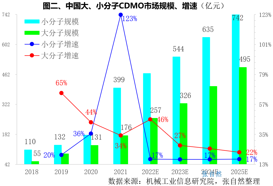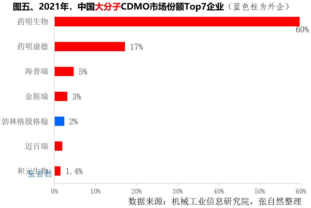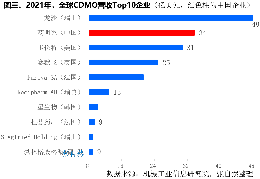 所謂CDMO,即定制研發生產機構(Contract Development and Manufacturing Organization),主要為藥企提供臨床新藥工藝開發和制備,以及為已上市藥物提供工藝優化和規?;a服務。CDMO產業在我國發展之迅猛可謂一時無兩,盡管近期資本市場有所波動,但優勢尚存,增勢不減。目前,全球CDMO行業仍處于高速發展期,按沙利文統計口徑,全球CDMO市場規模由2017年的394億美元增長到了2021年的632 億美元,到2025年將達到1243億美元。2015年開啟的醫藥創新熱潮促進了我國CDMO產業的高速發展,我國CDMO市場規模由2017年的132億元增長到了2021年的473億元,4年增長了2.6倍,復合年增長率高達37.7%,2倍于同期全球CDMO18.5%的復合增長率,預計到2025年將達到1571億元。我國CDMO市場規模在全球的占比也由2017年的5%提高到了2021年的13%,到2025年將占到全球市場的1/5。(詳見圖一)小分子一直在我國CDMO產業占據主導地位,按機械工業信息研究院統計口徑,我國小分子CDMO市場規模由2018年的110億元增長到了2021年的399億元,3年增長了2.6倍,預計2025年將達到742億元。我國大分子CDMO的市場規模由2018年的55億元增加到了2021年的176億元,預計到2025年將增加到近500億元(495億元)。2018年到2021年,我國大分子CDMO的復合增長率為47.4%,稍低于小分子的53.6%。受益于細分領域的突破,2021年-2026年,大分子的復合增長率將達到27.3%,將遠高于同期小分子16.8%的復合增長率。(詳見圖二)2021年,全球CDMO營收最大的企業是瑞士龍沙和我國的藥明系(藥明康德+藥明生物)。在Top10企業中,歐洲占了6席,美國和亞洲各占2席。如按國家來劃分的話,瑞士、美國和法國各占2席,即瑞士的龍沙(48億美元,第1位)、Siegfried Holding(9億美元,第9位),美國的卡倫特(31億美元,第3位)、賽默飛(25億美元,第4位)和法國的Fareva SA(21億美元,第5位)、杜芬藥廠(9億美元,第8位)。另有4個國家各占1席,即中國的藥明系(34億美元,第2位)、瑞典的Recipharm AB(13億美元,第6位)、韓國的三星生物(10億美元,第7位)和德國的勃林格殷格翰(9億美元,第10位)。(詳見圖三)2021年,在我國小分子CDMO市場份額Top10企業中,竟有4家來自同一個省的同一個地級市--浙江省臺州市,即九洲藥業、普洛藥業、聯盛科技和天宇股份,皆因臺州是我國乃至全球最重要的化學原料藥基地,知名原料藥企業海正、華海、司太立和海翔藥業等均位于臺州。帶量采購導致的藥價下降大大促進了藥品使用量的提升,原料藥的消耗量也隨之大幅增加,同時也推動了原料藥企業向下游制劑環節的延伸。臺州作為原料藥基地,在帶量采購背景下,其成本和技術優勢凸顯,從而實現了產業鏈的延伸和產業升級。在小分子市場份額Top10企業中,市場份額最大的是藥明康德(占了35%)。其次是后起之秀凱萊英(占11%),2022年前9個月,凱萊英營收同比增長高達167%,傲視群雄,歸母凈利增速更是高達292%。其后分別是博騰股份(8%)、康龍化成(4.4%)和圣諾生物(1.6%)。(詳見圖四)我國小分子CDMO企業格局相對穩定,大分子CDMO企業集中度高企。2021年,大分子CDMO市場份額最大的企業是藥明系(藥明生物+藥明康德),占了近8成市場(77%)。其次是金斯瑞(3%)、邁百瑞(1.8%)和和元生物(1.4%)。在Top企業中還有一家外企,即德國的勃林格殷格翰,占了2%的市場,如勃林格殷格翰為上海之江生物的新冠雙特異性抗體藥物SYZJ001提供工藝優化及生產制造服務。(詳見圖五)國內CDMO企業多服務于臨床階段的工藝開發和研究,因此需要大量的研發人員,如藥明生物、凱萊英等企業的研發人員數量占到了員工總數的40%以上,工程師紅利促進了我國CDMO產業的高速發展。2020年,全球重點CDMO企業中,人工成本最低的是我國的凱萊英,其單位人工成本為2.4萬美元/人,只有瑞士Siegfried Holding(12.4萬美元/人)的不到1/5。其次是我國的博騰股份(2.8萬美元/人)和藥明康德(3萬美元/人)也都遠低于瑞士龍沙的11.8萬美元/人、韓國三星生物的8.1萬美元/人。