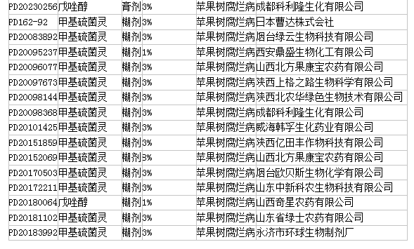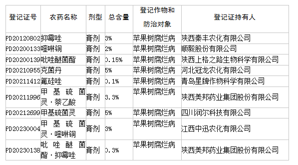 目前我國批準登記的膏劑(糊劑),主要為殺菌劑、植物生長調節劑,個別為衛生殺蟲劑。截至2023年5月10日,我國批準登記并處于有效狀態的殺菌劑膏劑(糊劑)產品共25個,其中膏劑10個,糊劑15個,涉及甲基硫菌靈(17個)、戊唑醇(2個)、抑霉唑(2個)、喹啉銅(2個)、吡唑醚菌酯(2個)、克菌丹(1個)、氟硅唑(1個)、萘乙酸(1個)等8種有效成分,登記作物和防治對象均為蘋果樹腐爛病。具體登記信息如下:
