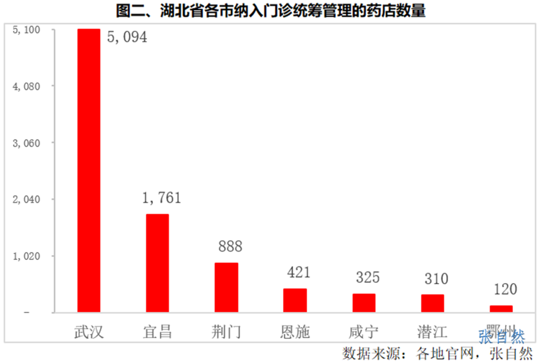 武漢對(duì)個(gè)賬分開反映最強(qiáng)烈,湖北是納入門診統(tǒng)籌管理藥店數(shù)量最多的省份,其屬下各市納入門診統(tǒng)籌管理的藥店數(shù)量如下: