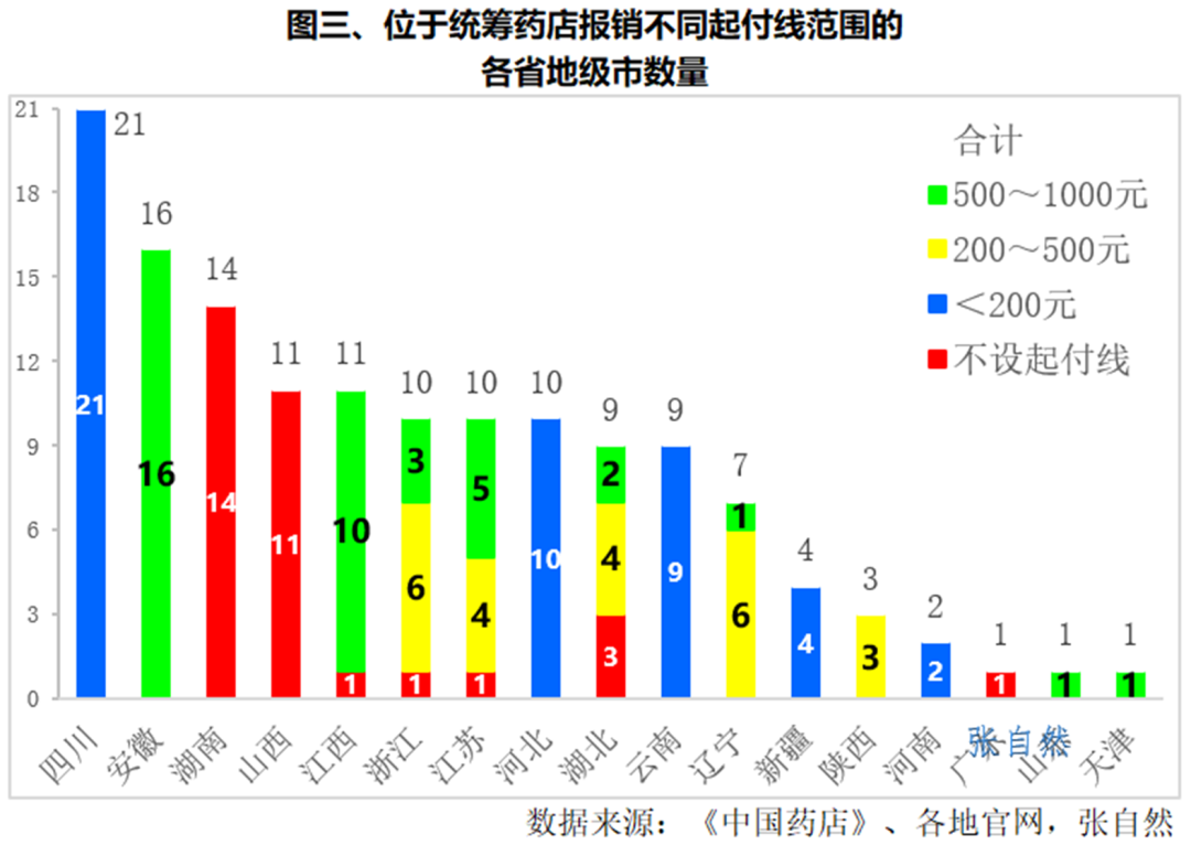 起付線<200元的占了1/3,涉及5省的46個(gè)地級(jí)市,即四川(21個(gè)市)、河北(10個(gè)市)、云南(9個(gè)市)等;