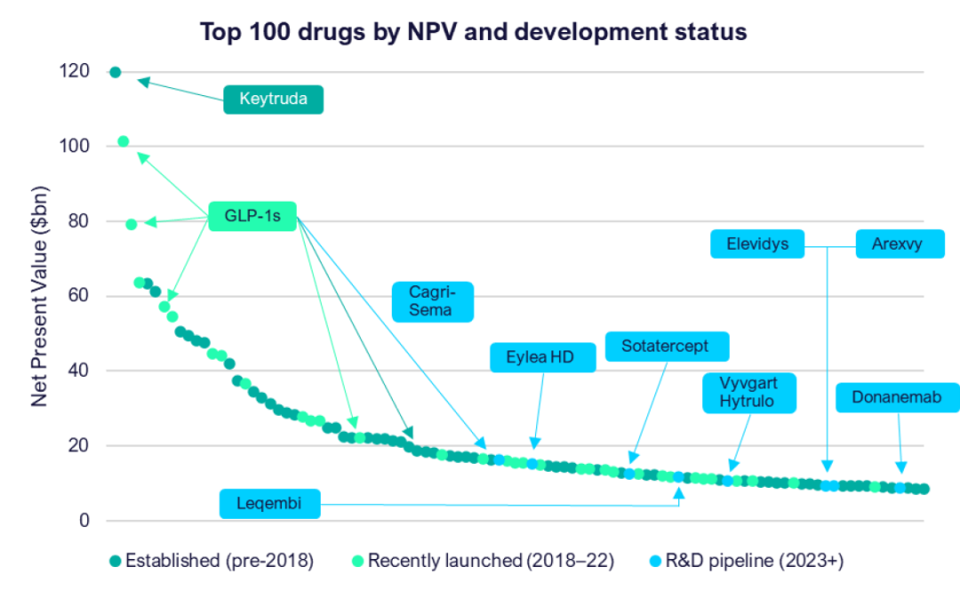 近期,Evaluate分析了100款主要藥物凈現值,包括Keytruda、Tirzepatide、CagriSema等重磅藥物,給出了醫藥領域關鍵藥物和藥物候選物的凈現值,每個點對應一款藥物,其顏色代表該藥物的上市年份區間。