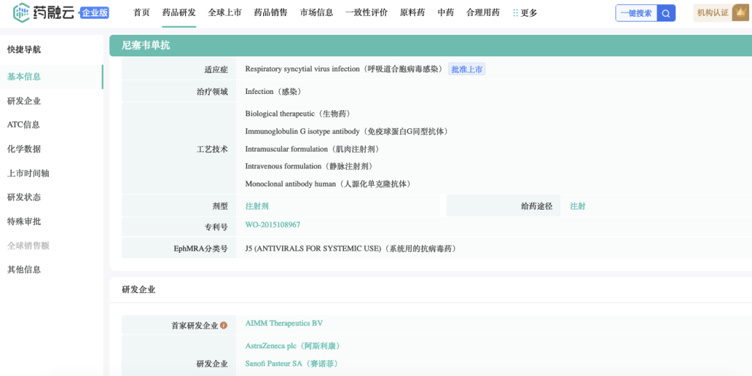 Nirsevimab相關(guān)專利:WO-2015108967。最早由荷蘭AIMM Therapeutics BV開發(fā);于2012年授權(quán)予MedImmune/阿斯利康。2017年3月,賽諾菲Pasteur與MedImmune/阿斯利康達成共同合作開發(fā)協(xié)議。