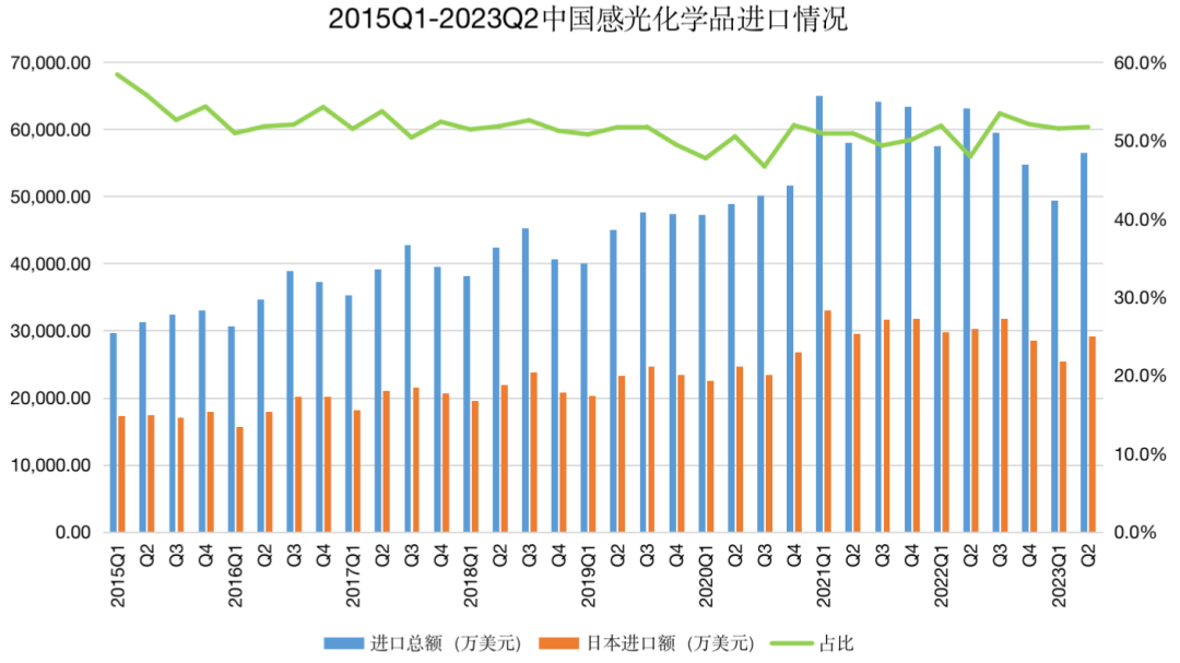 日本是全球光刻膠的主要生產地,近10年來,我國從日本進口的光刻膠占比一直超過50%,尤其在高端光刻膠領域更是重度依賴日本進口。據中國海關總署數據,2022年我國感光化學品進口總額23.50億美元,從日本進口額12.05億美元,占比51.3%。2023年1-6月份,從日本進口額為5.47億美元,同比下降9.1%,6月份進口額為1.06億美元,同比下降8.2%,環比增長9.4%。