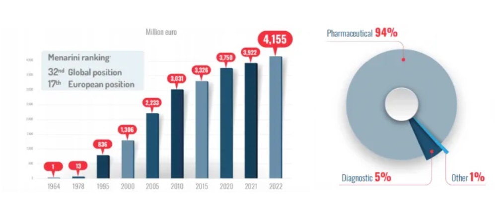 意大利作為歐洲生物醫藥制造傳統強國,在制藥領域具有獨特的技術、產品和龐大的研發體系,尤其是在抗腫瘤、抗精神病等藥物的制造技術與產品在國際處于領先地位。2018年意大利正式趕超德國成為歐盟最大的制藥國,產業規模達312億歐元(德國300億歐元),占全球醫藥市場份額約3%。Menarini集團作為意大利最大的醫藥企業,在歐洲制藥公司中更是位居前列,同時還是全球TOP50的藥企。