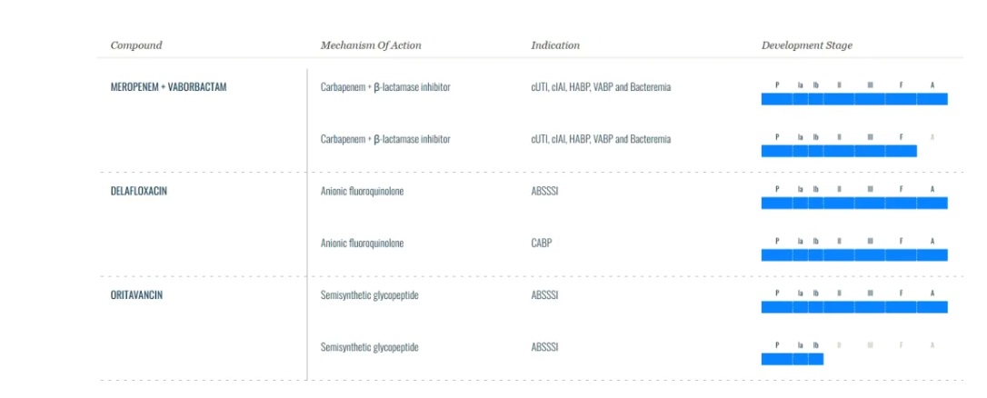德拉沙星是一種陰離子氟喹諾酮類藥物(FQ),與其他氟喹諾酮類藥物相比,具有更好的特性和安全性。它通過平衡抑制細菌DNA復制、轉錄、修復和重組所需的細菌拓撲異構酶IV和DNA回旋酶(拓撲異構酶II)發揮作用。目前已在美國和歐盟獲批用于治療成人急性細菌性皮膚和皮膚結構感染(ABSSSI);在美國用獲批于治療社區獲得性細菌性肺炎(CABP);2021年4月,在歐盟被批準用于治療CABP。