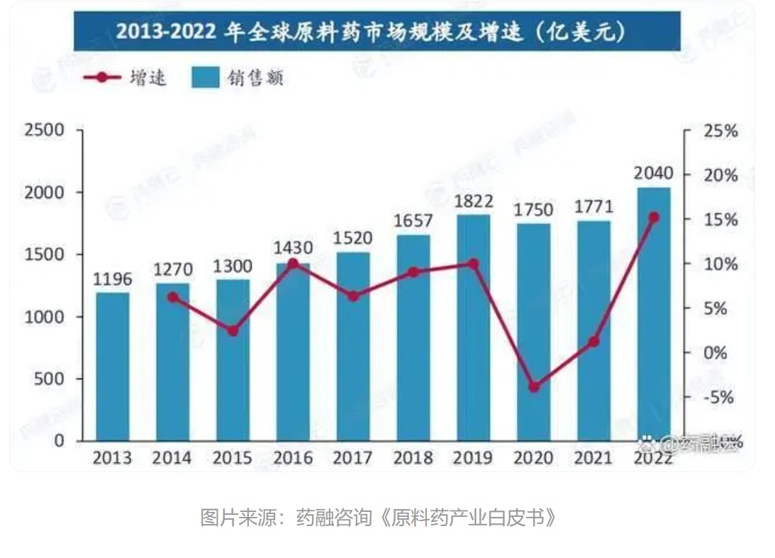 從全球范圍來看,原料藥市場在經歷了2020年新冠疫情的沖擊后逐漸恢復增長。全球原料藥市場規模在2020年受新冠肺炎疫情影響與2019年相比有所下滑,從1822億美元降至1750億美元,下降3.95%;但很快,市場從2021年開始便恢復了增長,2022年全球原料藥市場規模達到2040億美元。